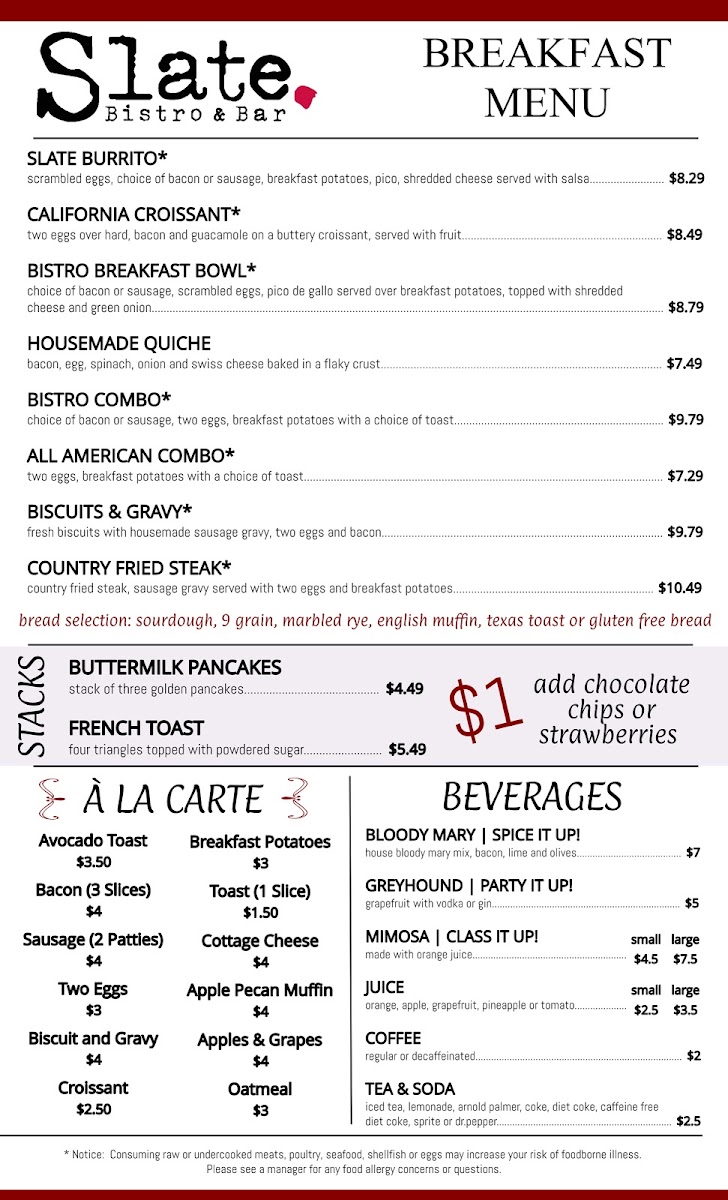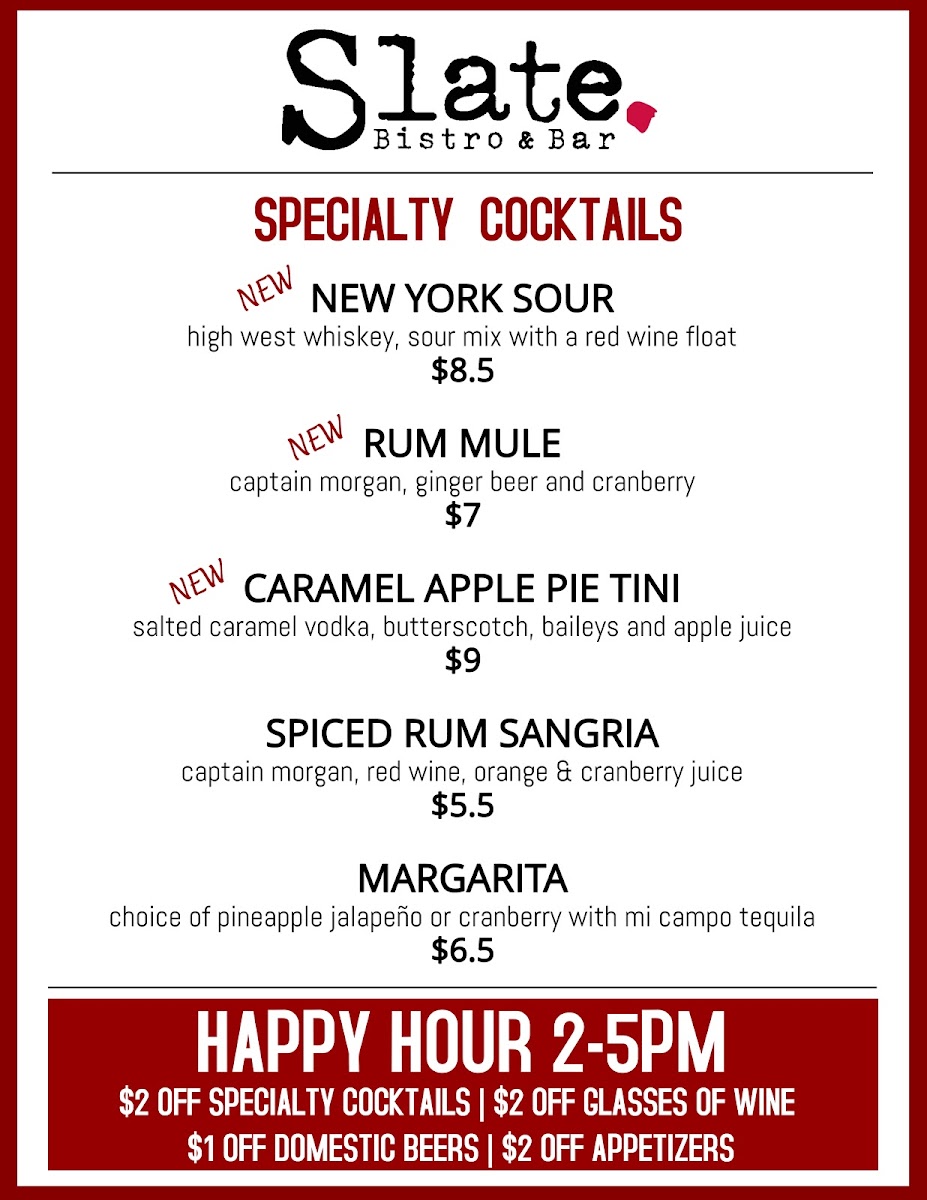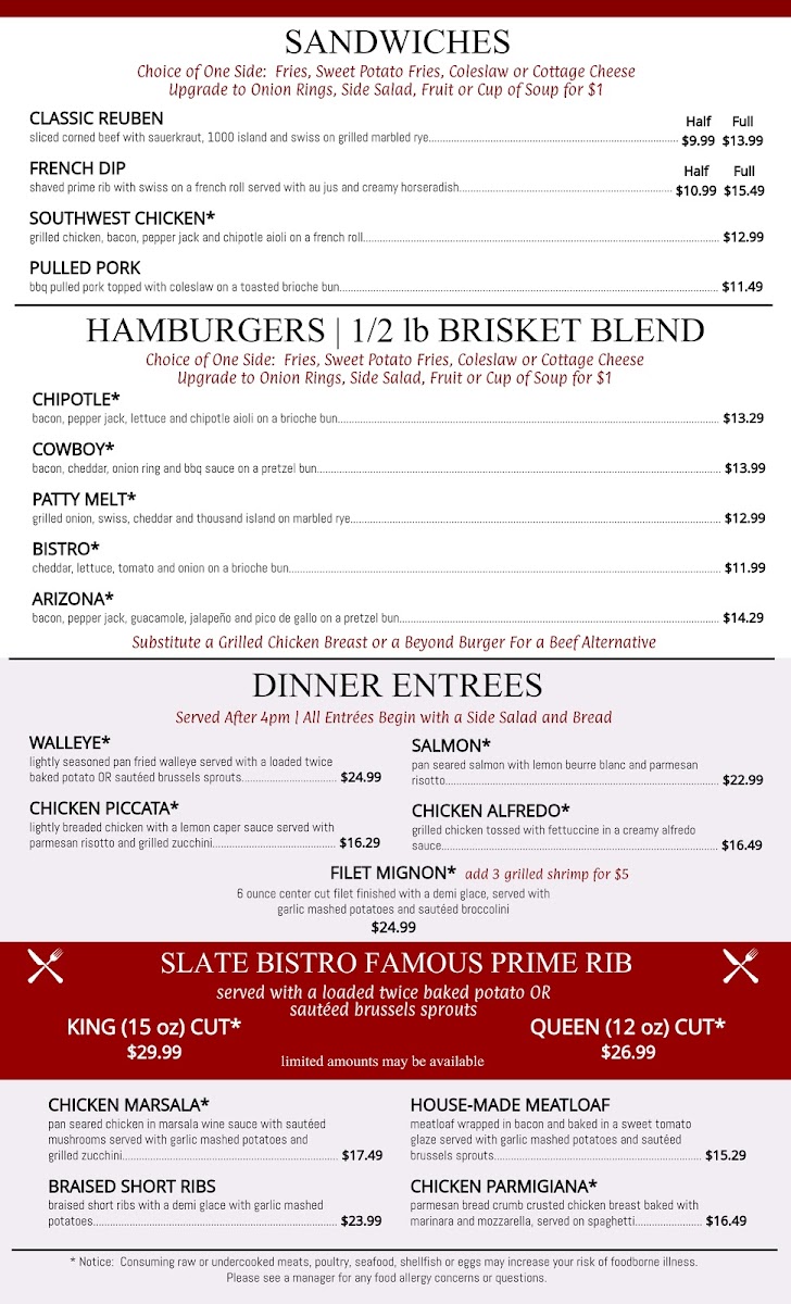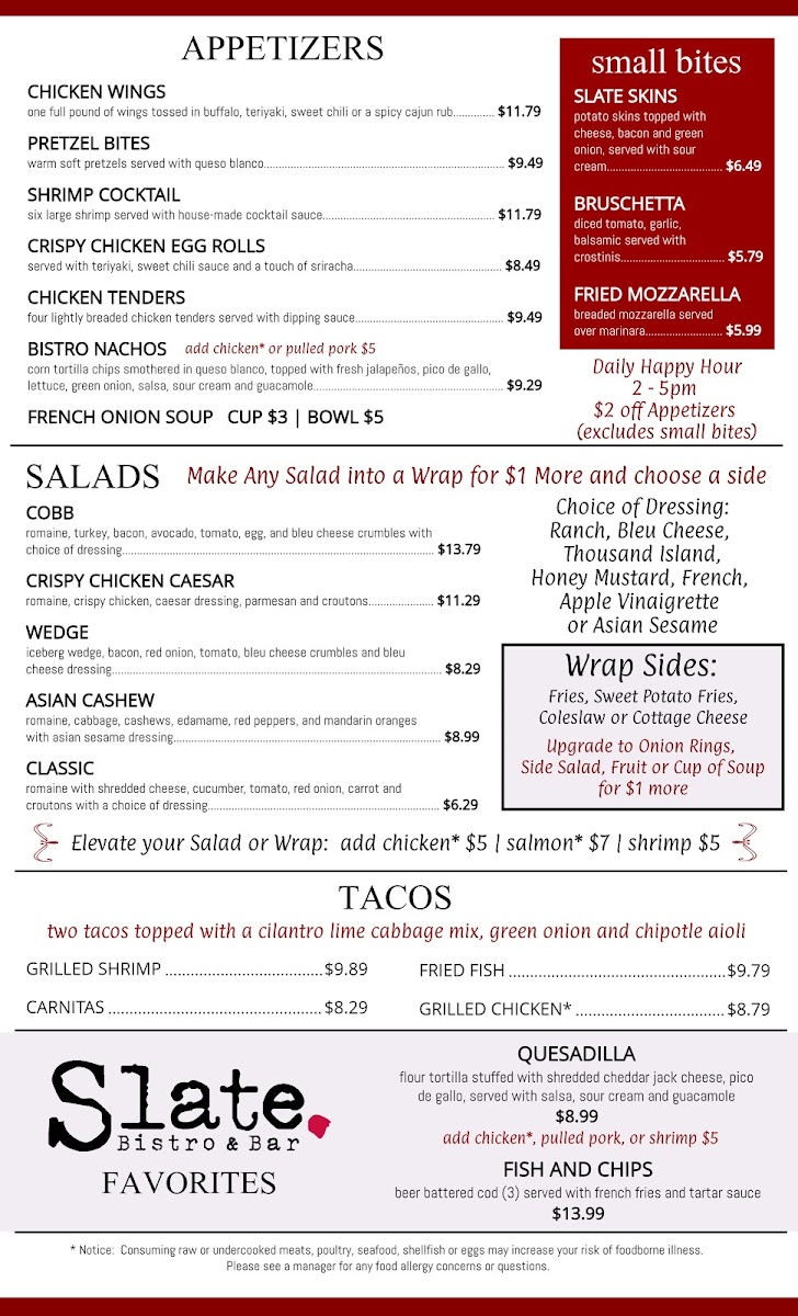 Whether you're celebrating a special occasion or enjoying a casual meal, Slate Bistro & Bar is your go-to destination for an unforgettable dining experience.